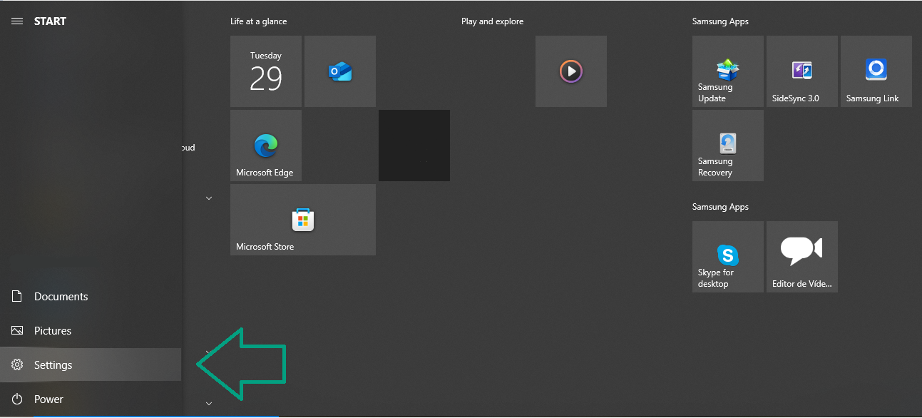 Primeiramente, acesse o Menu Iniciar e selecione “Configurações” (ícone da engrenagem).