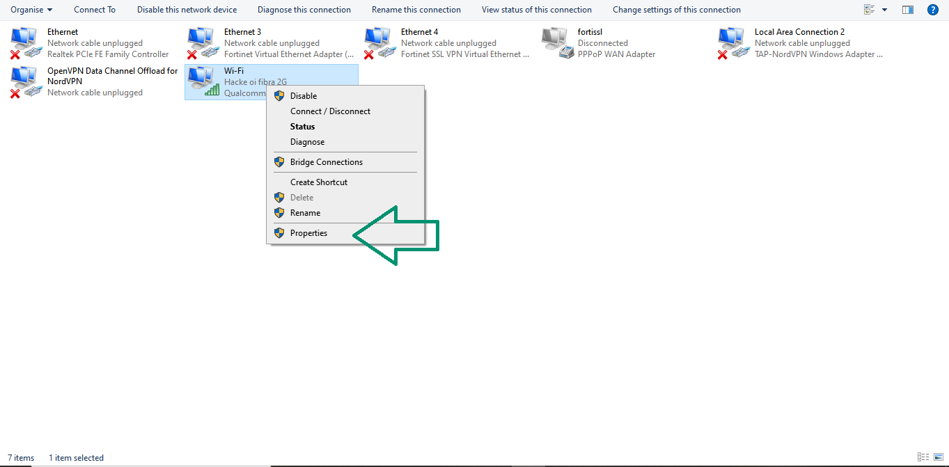 Clique com o botão direito sobre a conexão de internet em uso e escolha “Propriedades” — talvez seja necessário fornecer a senha de administrador.