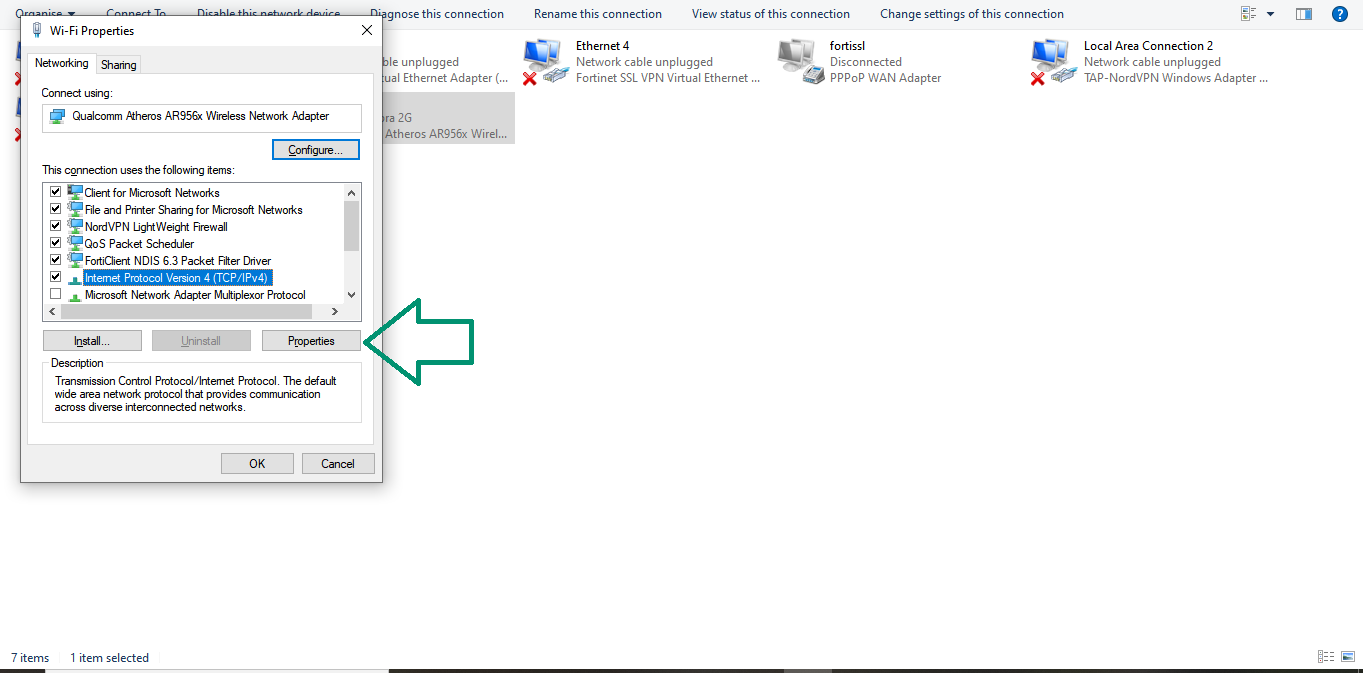 Localize “Protocolo IP Versão 4 (TCP/IPv4)” e clique em “Propriedades”.